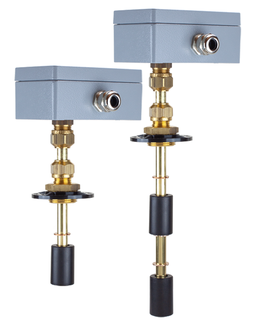HMCK-VV Level switch with two alarm levels. Robust junction box in powder-coated aluminium. Flange and adjustable G1" threaded coupling that becomes fixed after tightening. Probe in brass and float in NBR. Suitable for oil and other non-aggressive liquids.